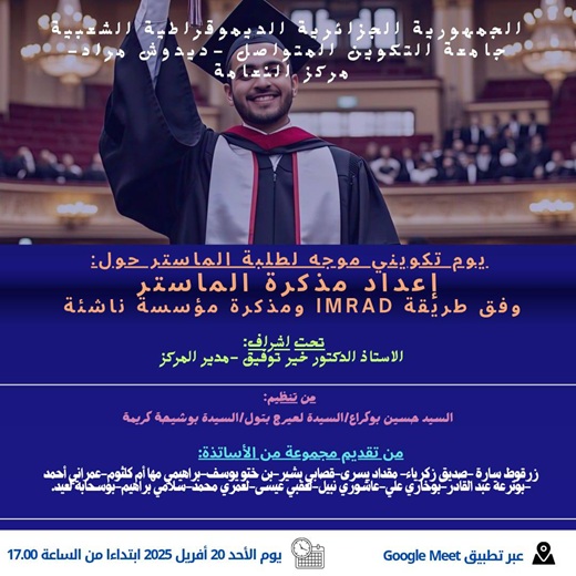 – ورشة علمية تكوينية بعنوان : منهجية إعداد مذكرة تخرج (وفق طريقة Imrad ومذكرة مؤسسة ناشئة) عبرGoogle mee