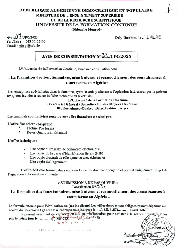 11 نوفمبر 2025 أخر الاخبار, استشارات ومناقصات 0 استشارة من أجل التكوين قصير المدى للموظفين ،وتأهيلهم وتجديد معارفهم