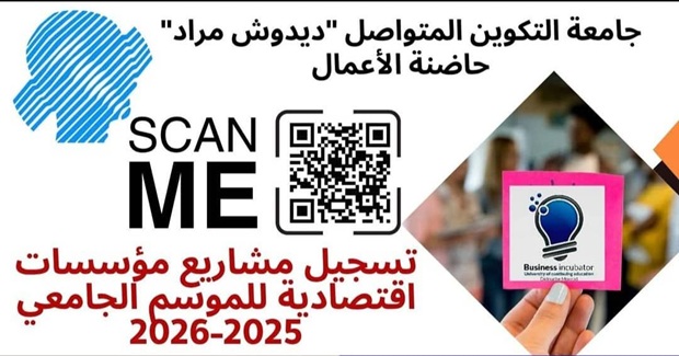14 نوفمبر 2025 أخر الاخبار, إعلانات, نشاطات حاضنة الأعمال 0 تسجيل مشاريع مؤسسات اقتصادية للموسم الجامعي 2025-2026 خلية الاعلام والاتصال طلبتنا الاعزاء في كل الاطوار لا تفوتوا فرصة ان تصبحوا رواد أعمال وقادة مشاريع اقتصادية واعدة .
