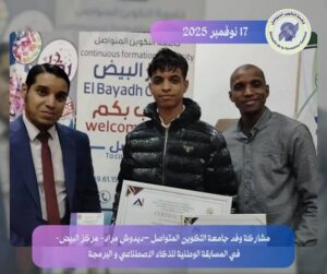 بعد إشراف مدير جامعة التكوين المتواصل ديدوش مراد ا.د.يحي جعفري بتاريخ 14 ديسمبر 2024م على تأسيس نادي الذكاء الاصطناعي من مركز البيض، تم بتاريخ 17/11/2025م تتويج النادي بجائزة التفوق في المسابقة الوطنية للبرمجة والذكاء الاصطناعي التي احتضنها المركز الجامعي نور البشير البيض، والتي شكّلت محطة علمية مهمة للتنافس، والإبداع، واستشراف ما يمكن أن يقدمه الذكاء الاصطناعي لمجتمعنا.