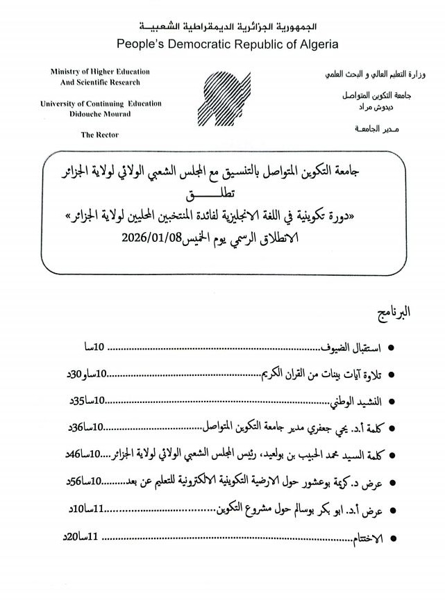 في اطار تعميم استعمال اللغة الانجليزية وتمكينا للفاعل المحلي من الرفع من قدراته اللغوية بما يتيح له مساهمة أفضل في التنمية الوطنية تنظم الجامعة هذه الدورة التكوينية المكثفة للسادة أعضاء المجلس الشعبي الولائي وكذا رؤساء المجالس الشعبية البلدية لمدة شهرين حضوريا وعن بعد .