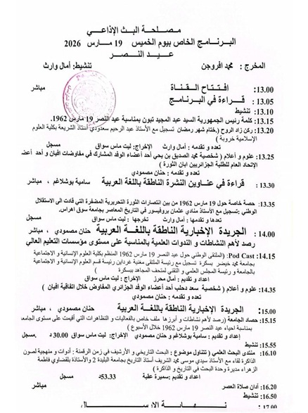 17 مارس 2026 أخر الاخبار, برامج إذاعية 0 البرنامج الإذاعي الخاص بإحياء عيد النصر خلية الإعلام والاتصال البرنامج الإذاعي الخاص بإحياء عيد النصر تخليدا لذكرى وقف اطلاق النار 19 مارس 1962.