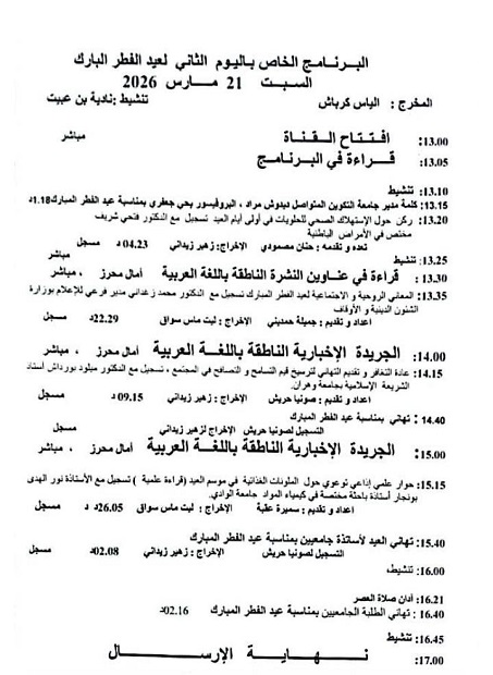 19 مارس 2026 أخر الاخبار, برامج إذاعية 0 البرنامج الاذاعي المسطر لأيام عيد الفطر خلية الإعلام والاتصال البرنامج الاذاعي المسطر لأيام عيد الفطر على أثير إذاعة جامعة التكوين المتواصل بالإذاعة الوطنية .