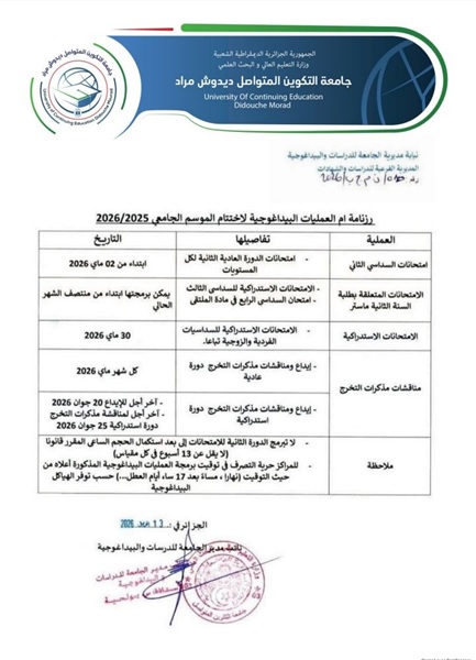 رزنامة أعمال نهاية الموسم الجامعي 2026/2025